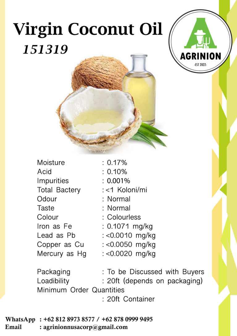 Is a pure natural oil and imfamously known to have higher quality and more benefits than ordinary coconut oil, because it goes through different extraction processes. Virgin coconut oil is obtained directly from fresh coconut milk without going through the process of heating, refining, bleaching, and scenting so it does not change the natural properties of the oil. This makes the word “ virgin ” clear in front of “ coconut oil ”. Generally VCO is used for cosmetic raw materials and is also consumed directly as a high-calorie nutritional intake.